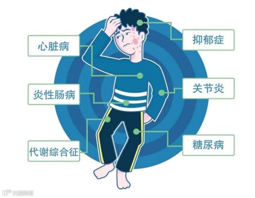 临床表现根据中国银屑病诊疗指南(2018简版)的银屑病分型体系,分为斑块状银屑病、点滴状银屑病、脓疱型银屑病、红皮病型银屑病和关节型银屑病,其中斑块型占90%以上。其中寻常型银屑病又分为点滴状银屑病、斑块状银屑病(85%以上)、反向性银屑病;脓疱型银屑病又分为掌趾脓疱型和泛发性脓疱型。临床皮疹表现为头部、四肢伸侧、躯干等部分的众多境界清楚、形状大小不一的浸润性红斑,表面覆有银白色鳞屑,常冬季加重、夏季减轻。与银屑病相关的并发症主要包括:关节炎、心血管疾病、代谢综合征、糖尿病、自身免疫性疾病等。