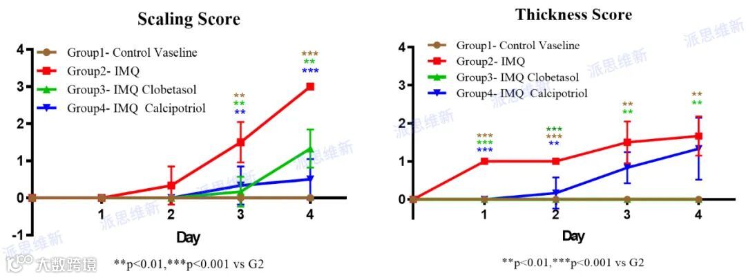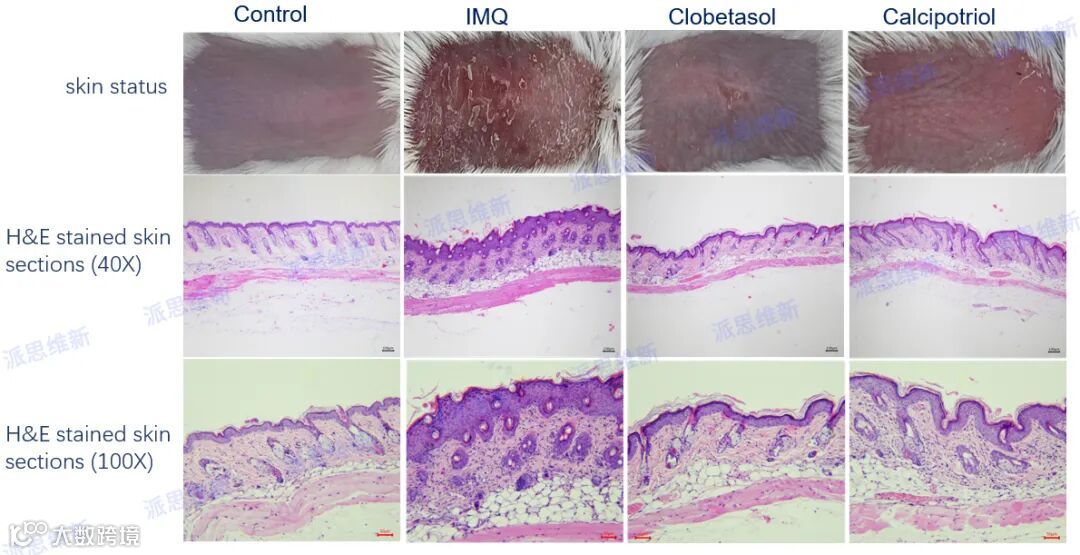 该模型是通过IL-17/IL-23轴的免疫介导而产生,具有典型的银屑病病理改变,包括棘层肥厚、细胞角化不全、新生血管发生,CD4+T细胞、CD11c+DCs、pDCs浸润等,以及VEGF表达上调。但部分鼠皮损不典型,且缺乏完全的T细胞亚群的炎症浸润,以及皮疹持续时间较短。有研究发现,建模的效果与咪喹莫特的生产厂家有关。近来也有新的建模方式的报道,如建模时同时加用干扰素腹腔内注射,以及使用咪喹莫特诱导 K14-VEGF小鼠等,其模型的效果更佳,且皮损可以维持2周不退。