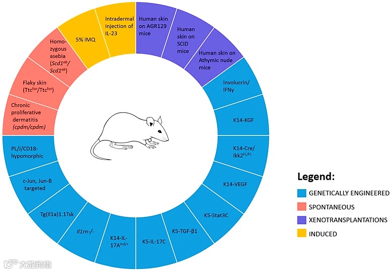 银屑病的小鼠模型可分为自发性,基因工程 (转基因和基因敲除),异种移植和直接诱导。