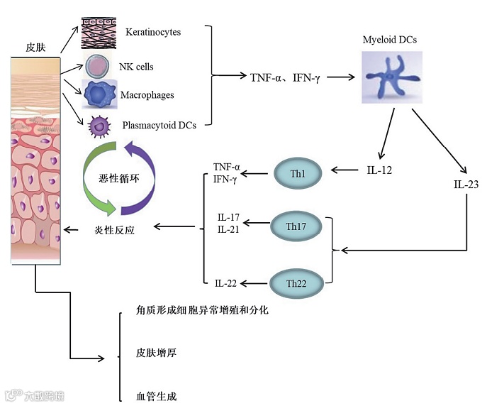 在研究自身免疫性疾病时最早发现并提出银屑病发病的“IL-23/Th17 通路”理论, 近年来人们对IL-23/Th17 通路有了更深入的认识和了解。一般认为在IL-23的刺激下,幼稚T细胞与激活的树突状细胞(DC)相互作用后分化为Th17,Th17细胞分泌IL-17(包括IL-17A和IL-17F),与角质形成细胞的IL-17R结合,角质形成细胞在IL-17的刺激下异常增殖和分化,产生趋化因子和血管生成因子,刺激炎症细胞的聚集,建立正反馈循环。趋化因子CCL20 是角质形成细胞衍生的重要核心成分,其功能是将 Th1、Th22和Th17细胞召集到活跃的受损皮肤中,Th1和Th22细胞通过产生炎症因子来放大核心反应,以及角质形成细胞衍生的血管生成因子和趋化因子,最终导致银屑病皮损的形成。