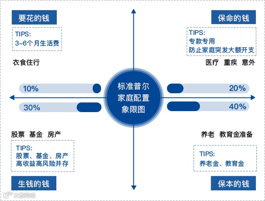 下面这张图被公认为最合理稳健的家庭资产分配方式。标准普尔家庭资产象限图把家庭资产分成四个组成部分,每个部分的作用不同,资金的投资渠道也各不相同。