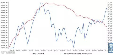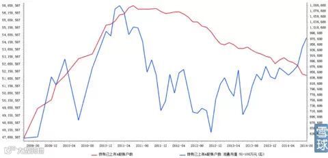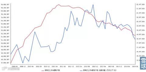图8:持仓总账户数(红线)与持有市值为1000万~1亿元的账户数(蓝线)