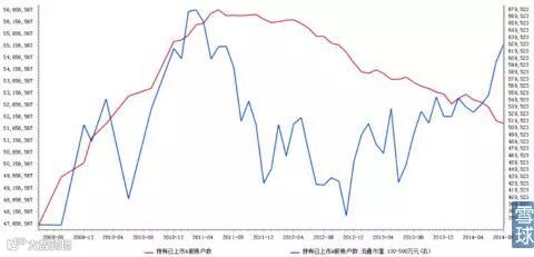图6:持仓总账户数(红线)与持有市值为100~500万元的账户数(蓝线)