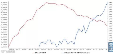 图2:持仓总账户数(红线)与持有市值为1万元以下的账户数(蓝线)