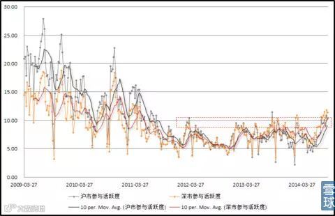 1. 截至2014年9月12日,沪深市场的参与活跃度已经(或者是刚刚)超越了两年半以来的阈值上限,表明目前市场参与热情很高。