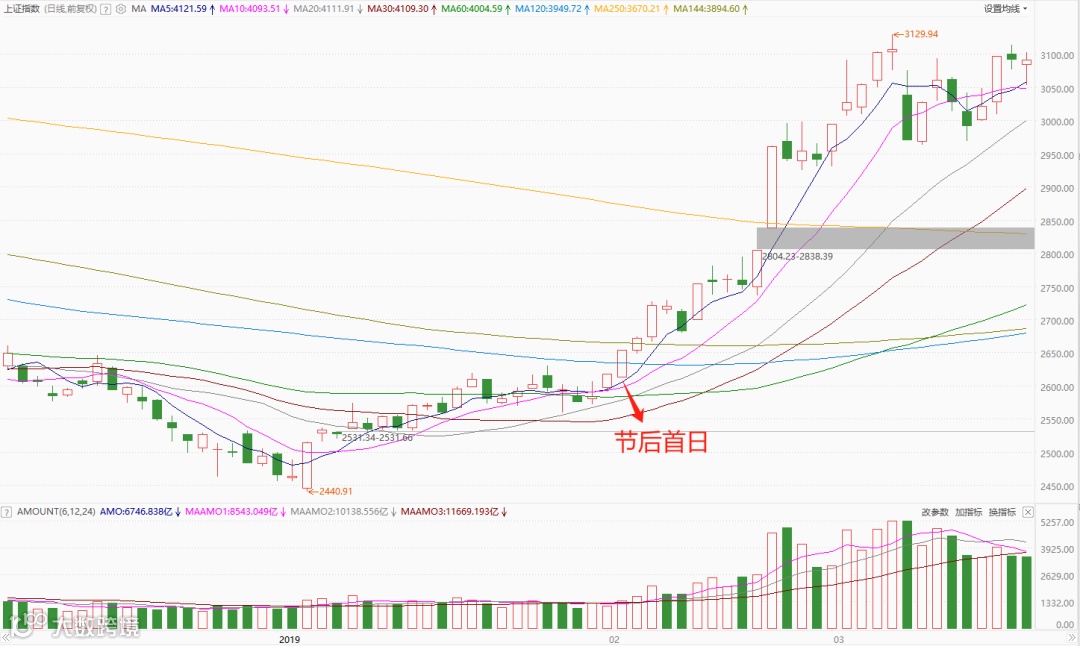 2019年春节:节后首日放量大涨突破,随后开启一波主升浪,行情进入到加速阶段,市场赚钱效应极佳。