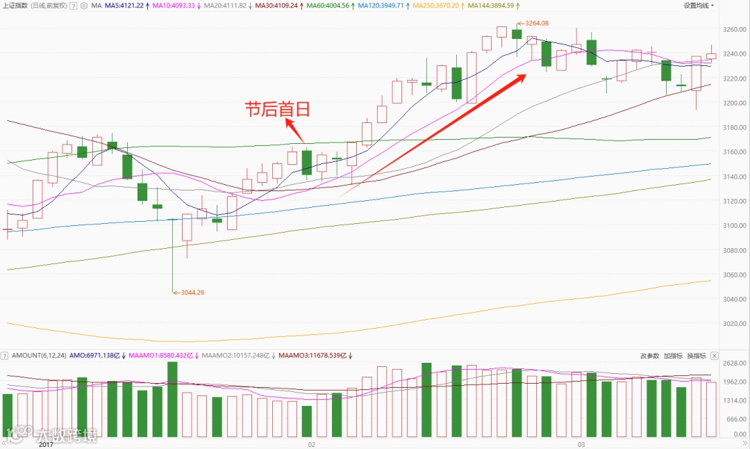 2017年春节:沪指节后首日稍稍高开后低走,未能实现开门红,但随后在流动性的改善下,走出单边上涨行情。