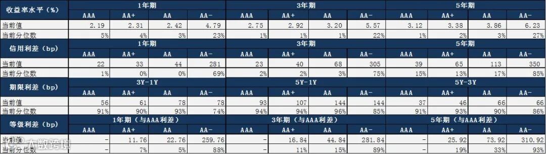 截至7月22日,各期限AA及以上等级信用债收益率普遍处于历史5%分位数以下,收益率普遍较低;信用利差和等级利差方面,中高等级1年期及以内期限短融和3年期中票信用利差和等级利差处于历史20%以内分位数,中短久期、中高评级品种信用利差和等级利差继续压缩的空间已不大;AA-品种信用利差和等级利差仍处于较高分位数;期限利差方面, 3年期和5年期中票期限利差普遍处于历史90%分位数以上,期限利差仍然较高。