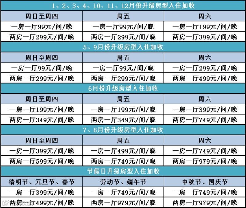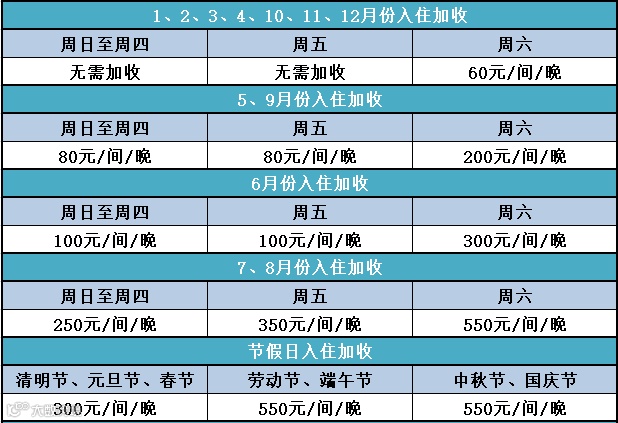 ◆ 升级房型与旺季平日、周末、节假日需叠加加收