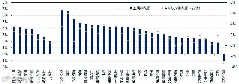 市场受到央行降准等政策利好刺激,实现开门红。上证综指,中小板指和创业板指涨跌幅分别为2.62%,5.06%和3.87%。从行业指数来看,农林牧渔(8.74%)、有色金属(6.48%)、传媒(5.59%)、建材(5.21%)、纺织服装(4.53%)等行业表现相对较好,食品饮料(0.27%)、电子(1.75%)、交通运输(1.87%)、银行(1.88%)、医药生物(1.90%)等行业表现靠后。
