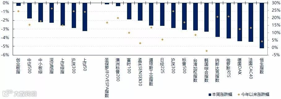 股票市场方面,受内外部事件尤其是欧美股市显著调整影响,A股整体走弱,结构上中小创表现优于主板。全周上证综指,中小板指和创业板指跌幅分别为2.60%,2.16%和0.33%,中小板指和创业板指相对主板跌幅较小。从行业指数来看,农林牧渔(3.67%)、有色金属(0.76%)、休闲服务(-0.17%)、传媒(-0.88%)、公用事业(-1.12%)等行业涨幅居前;房地产(-5.36%)、非银(-4.72%)、建筑材料(-4.55%)、交通运输(-3.38%)、建筑装饰(-3.20%)等行业跌幅居前。