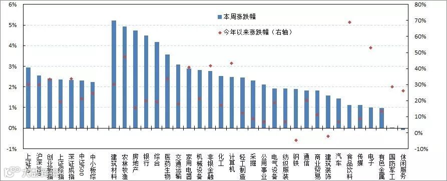 股票市场方面,上周A股市场持续反弹,行业轮动向上。上证综指,中小板指和创业板指涨跌幅分别为2.36%,1.77%和2.41%。从行业指数来看,建筑装饰(5.23%)、农林牧渔(4.92%)、房地产(4.74%)、银行(4.50%)、综合(4.18%)等行业表现相对较好,休闲服务(-0.09%)、军工(0.03%)、有色(0.98%)、电子(0.99%)、传媒(1.11%)等行业表现靠后。