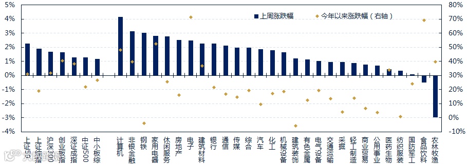 股票市场方面,上周市场普遍上行。上证综指,中小板指和创业板指涨跌幅分别为1.91%,0.79%和1.66%。从行业指数来看,计算机(4.16%)、非银(3.15%)、钢铁(3.04%)、家电(2.80%)、休闲服务(2.78%)等行业表现相对较好,农林牧渔(-2.98%)、食品饮料(-0.49%)、军工(0.09%)、纺织服装(0.33%)、医药生物(0.46%)等行业表现靠后。
