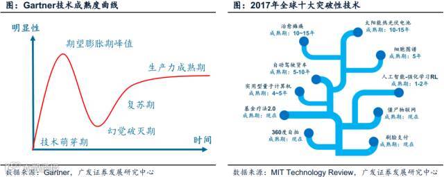 以人工智能为例,随着计算/储存能力大幅提升以及神经网络的持续进步,人工智能发展速度较快,如智能机器人、认知专家顾问、机器学习、自动驾驶汽车等热门技术均在曲线左上方期望值较高区域,但是,人工智能距离完全成熟仍需5-10年。