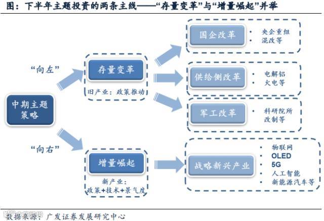 1、从存量和增量两个维度来看,下半年我们看好“改革+新产业”主题配置:一方面是确定性的改革主线;另一方面是正在渗透的技术革新主线。