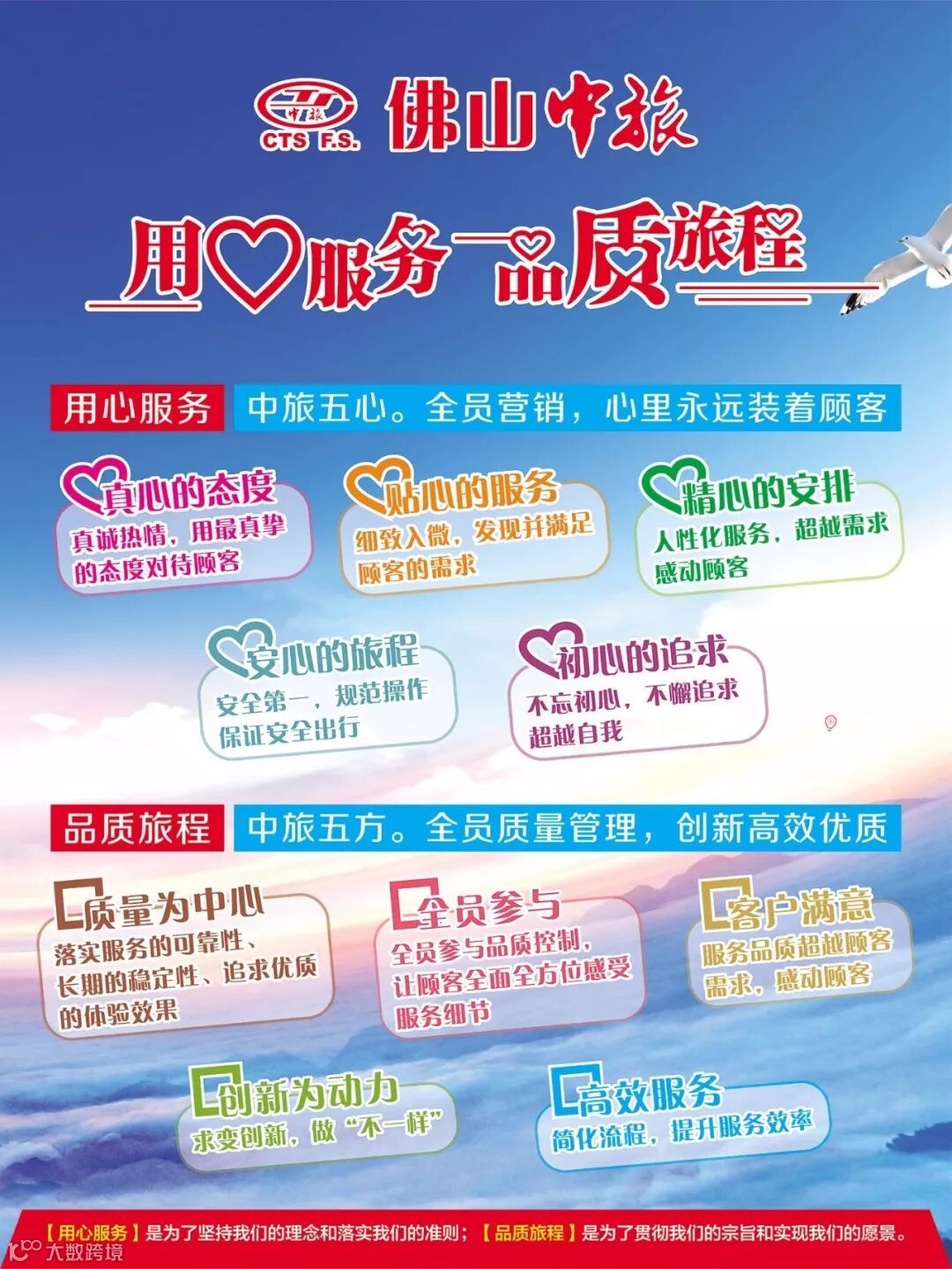 面对新的市场机遇和挑战,为了实现佛山中旅的可持续发展,我们将服务注入了新的标准:真心的态度,贴心的服务,精心的安排,安心的行程,舒心的旅情。