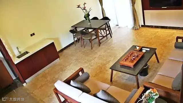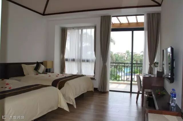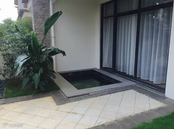 一间大床房一厅、独立温泉池、阳台直接进入泳池,独立淋浴间、带花园。