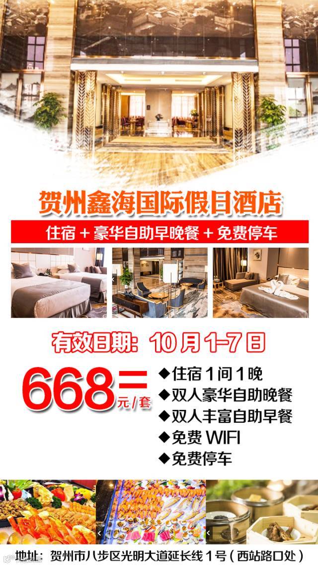 贺州鑫海国际假日酒店位于广西贺州八步区光明大道延长线1号(西站路口处),位置优越,距贺州市商业中心、汽车总站、动车站、贺州高速出口各约5-10分钟车程。
