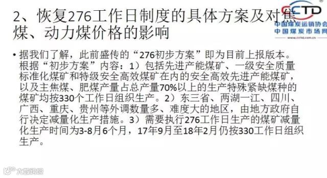 第二点是恢复276工作日制度的具体方案及对焦煤、动力煤的价格影响。今年年初出台了276工作日制度的草案,出台的背景是预计2017年煤炭总需求为39到40亿吨,而考虑到减量置换和增减挂钩、新投产煤矿生产能力、煤炭进口及去产能等因素,煤炭的总供给约为40到42亿吨,总体上还是处于供大于求,所以应该继续执行276个工作日(276是在330的基础上减去节假日),并对实施范围和具体措施进行调整完善,保障煤炭市场的稳定和能源的安全,避免煤炭价格的大起大落。