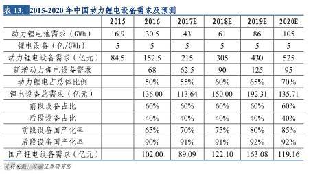中国化学与物理电源行业协会统计数据显示,随着各动力电池企业产能扩张步伐的加快,锂电设备行业国产化率也同步提升。2016 年动力锂电池出货量为 30.5Gwh,假设每1GWh 锂电池产能的锂电设备平均价格为 5 亿元/GWh,并假设未来 4 年动力锂电池占比由 50%提升到 70%。根据前述需求测算的 2016-2020 年中国动力锂电池需求分别为 30.5、43、61、86、105GWh。同时假设锂电设备的前段国产化率由 65%提升到 85%,后段国产化率由 90%提升到 92%,前段及后段设备比例维持 6:4,我们预测 2016-2020 年国产锂电设备投资需求将由 102 亿元先升后降,达到 119.16 亿元。