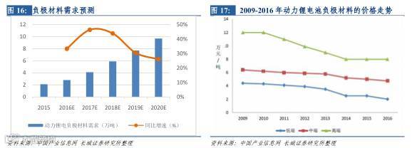 2016 全年国内负极材料产量 12.25 万吨,同比增长 68.27%;产值为 66.39 亿元,同比增长 64%。2016 年虽然负极材料价格保持着缓慢下滑趋势,由于高附加值的人造石墨和高端天然石墨占比上升,全年国内负极材料产值增速仅仅略低于产量速度。 我们认为负极材料快速增长主要原因包括: