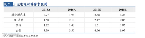 从需求来看,三元电池除了用于电动车之外,主要的需求集中在 3C 电子类消费。目前,笔记本电脑所使用的锂电池正极材料 65%左右为钴酸锂,35%主要使用三元材料;而手机与平板电脑使用的锂电池正极材料 75%为钴酸锂,剩余的 25%为三元材料。笔记本和平板电脑在 2015 年产量已经出现负增长,不过总体需求基本平稳,手机总产量近两年保持 10%以上增速,可以预期未来 3C 下游继续保持低增速的发展态势。与钴酸锂正极材料相比,三元材料具备价格优势,同时在循环稳定性、热稳定性和安全性能上有所改善,我们认为未来几年的 3C 电子市场中,三元材料将逐渐侵占钴酸锂在 3C 市场的份额。