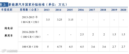 稳定增长期(2016-2020 年):2014-2015 年,新能源汽车市场的高速增长同时也带来了一些问题,国家+地方补贴额度 1:1 的模式存在对新能源汽车,尤其是轻型客车过度补贴的轻型,少数客车企业为了拿到高额补贴,实施了不少骗补措施。