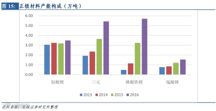 国内正极材料前十的产能合计约 16 万吨,十强之外仍有 200 多家正极材料生产企业,累计产能已超过 2015 年全球正极材料的出货量 17.4 万吨。我们认为,正极材料由于在 3C消费电子年代扩产太快,明显过剩的态势将始终存在,而未来高端三元正极材料,如 622、811、NCA 等有望保持紧缺。