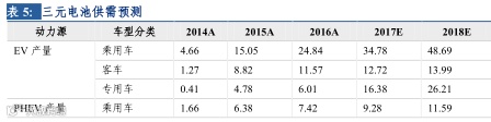 纯电动乘用车电池三元化趋势明显:2017 年新能源乘用车补贴方案同样以电池能量密度为主要考核标准,电池能量密度在 90-120whkg,可以获得标准补贴额度,电池能量密度大于 120wh/kg,则可以获得标准补贴的 1.1 倍。另外,补贴等级也是按照续航里程进行划分,续航里程100-150km的车型可以获得2万元补贴,150-250 公里补贴为 3.6 万,250 公里以上补贴为 4.5 万。与续航里程紧密相关的参数同样是电池能量密度。与商用车不同,乘用车空间相对较小,没有存放更多电池包的空间,因此,高能量电池将是新能源乘用车的首选方案。从 2017 年的三批目录看,三元电池占比在不断提升,以第三批为例,共发布 33 款纯电动乘用车车型,其中采用三元电池的车型有 29 款,占 87%。但结合 2016 年已有的车型销量、搭载的电池类型和单车电量看,三元的渗透比例不足 50%。因此,我们预计三元电池 2017 年将有较大的提升空间,渗透率预计到达 70%。