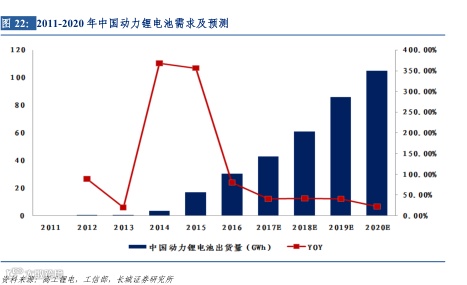 根据下游应用领域不同,锂电池主要分为消费型锂电池、储能型锂电池、动力型锂电池等。随着国家新能源汽车技术的不断突破以及相关政策的不断加码,动力锂电池需求将迎来爆发。2016 年年底以来, 动力锂电池 利好政策频出。2016 年 11 月底,工信部公开征求对《汽车动力电池行业规范条件》(2017 年)的意见,要求 动力锂电类 单体 产能不于 低于 8GWh 。2017 年 3 月 1 日,工信部、发改委、科技部和财政部共同印发《促进汽车动力电池产业发展行动方案》的通知。方案提出到 到 2020 年动力锂电池总产能超过100GWh模 ,形成年产销规模 40GWh 以上的龙头企业。2016 年动力锂电池出货量为30.5Gwh,据新能源汽车增长趋势推断,2017-2019 年动力锂电池复合增速将超 40%。