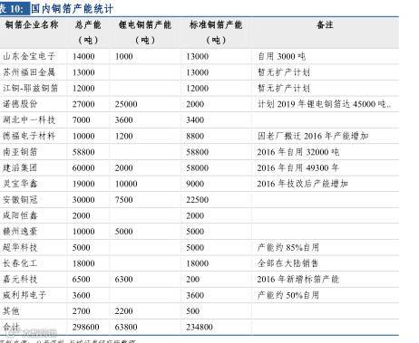 目前铜箔在锂电池中的使用量为 0.8-1kg/kWh,若以 75 元/kg 的市场价计算,在锂电池的成本中占比约为 5%。2017-2018 我国动力电池锂电箔需求分别为 7.5 万吨、8.9 万吨,目前国内锂电铜箔产能较低,2016年底有效产能约 6.38 万吨。考虑到新增产能释放因素,预计 2017 年年锂电铜箔产能达 8 万吨,2018 年新增产能释放后缓解部分产能紧缺,直到铜箔完成新一轮的产能扩张,供需状况或从短缺转为过剩。