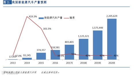 我们预计,2017-2020 年复合增长率 40%:首先,政策环境稳定,国家补贴政策的持续支持,2017-2020 年国家补贴标准已经确定,地方补贴不超过国补的 50%,不存在政策不确定性。其次,新能源乘用车进入快速增长期,以 A0 级及以下的小型电动车具备较大的发展空间,将成为新能源乘用车推广利器。再次,新能汽车产业链相关企业成长迅速,电池及先关材料不乏具备国际竞争力的企业,为新能源汽车的发展提供配套支持。