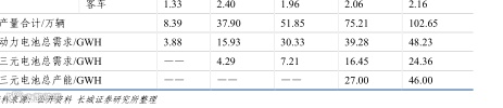 根据测算,到 2020 年国内动力电池需求规模将达到 105Gwh,五年累计增量约为 275Gwh。按照当前磷酸铁锂、三元材料等正极材料在不同车型动力电池的渗透率情况,并结合我们对未来发展趋势的判断,可测算 2020 年三元材料电池需求量将达到 55Gwh,磷酸铁锂电池需求量为 37Gwh,对应 2017-2020 期间三元动力锂电池的年均复合增速为 59.14%、磷酸铁锂动力锂电池的年均复合增速为 22.1%。动力电池已经明显产能过剩,在动力电池的技术走向中,三元正在成为大趋势,2016 年三元动力电池产量占比 34%,同比增长 11%,占比的增长主要受益于乘用车销量增长的拉动;2016 年三元电池价格进一步下降,磷酸铁锂在格上已无多少优势。随着客车三元电池的解禁,将进一步推动三元锂电池发展。 我们认为, 三元电池产能将连续保持 高增长 态势 ,到 到 2020 年能 达到动力电池 60% 以上的市场 份额 。