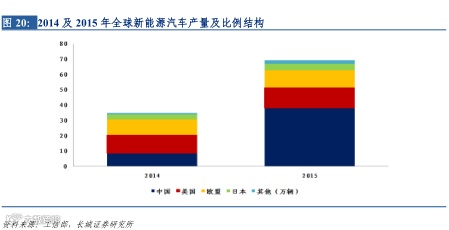 新能源汽车受益于环境保护要求日益提高的大环境,近两年来市场需求取得爆发性增长。世界主要工业国均出台了鼓励以电动汽车为主的新能源汽车发展政策,各主要锂电池商也加大了产能扩张力度。工信部统计数据显示,2015 为 年全球新能源汽车产量为 69.19万辆,同比增长 97.9% 。中国市场产量达 37.89 万辆,在全球市场所占比重由 24.01% 上升到 54.76%,超越美国和欧盟成为全球最大的新能源汽车产销国。