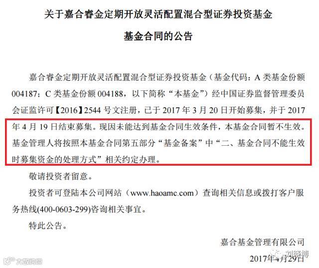2017年4月29日,嘉合基金发布公告:“嘉合睿金定期开放灵活配置混合型证券投资基金”因未能达到基金合同生效条件,基金合同暂不生效。(见下图)