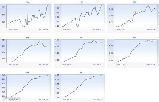 下图是截止到4月28日,各期限品种Shibor的历史走势,所谓Shibor就是上海同业拆借利率,通俗点说就是银行间互相借钱的参考利率。可以发现几乎所有期限的Shibor都处于上涨趋势中。上海银行间市场的7天期拆借利率(SHIBOR一周)更是在4月28日刷新2年来的新高。