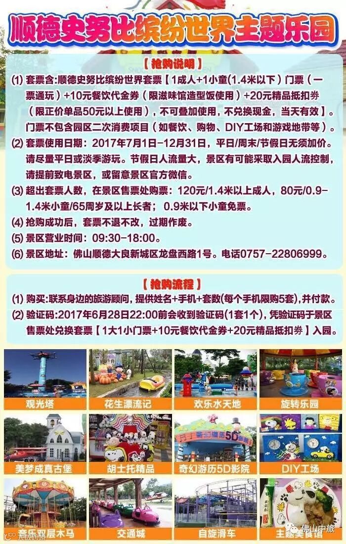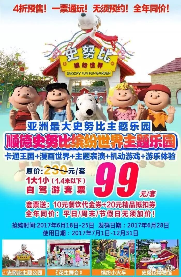 (1)套票含:顺德史努比缤纷世界套票【1成人+1小童(1.4米以下)门票(一票通玩)+10元餐饮代金券(限滋味馆造型饭使用)+20元精品抵扣劵(限正价单品50元以上使用),不可叠加使用,不兑换现金,当天有效】。门票不包含园区二次消费项目(如餐饮、购物、DIY工场和游戏地带等)。