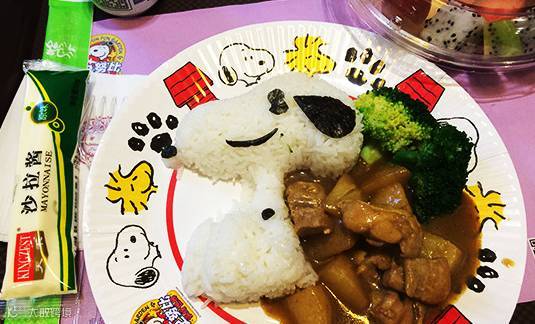 园区内有别具风味的餐饮服务,史努比小食亭,主要提供西式快餐;滋味馆主要提供中式快餐和特色小吃;户外茶座和树屋茶座,主要提供饮料和雪糕。丰富的午餐,米饭装饰成史努比模样,非常有心思。