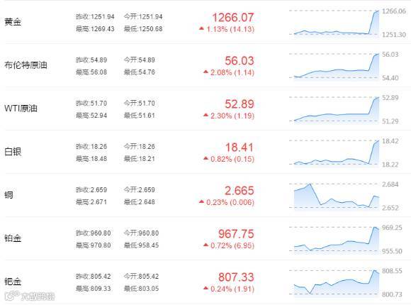 此外,现货黄金大涨至美国大选以来新高,飙升近20美元至1267美元,白银一度上涨1%。原油亦反应明显,布伦特原油、WTI原油期货双双涨超2%。