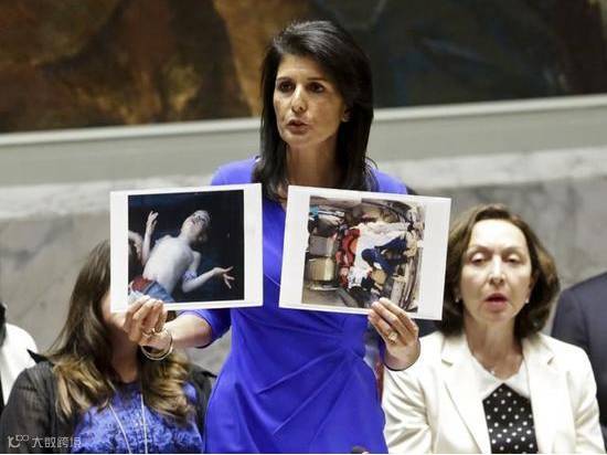 4月5日,美国常驻联合国代表妮基·黑莉在安理会会议上展示叙利亚疑似化武事件相关照片。(新华/美联)