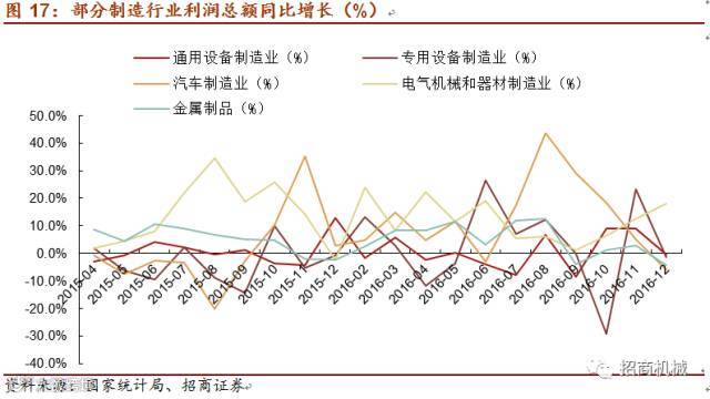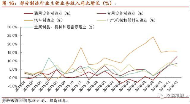 我们认为制造业盈利改善主要在2017年,与制造业投资相关的工业设备均将受益。2016年通用设备制造、专用设备制造、汽车制造、电气机械和器材制造、金属制品等几大行业企业主营业务增长均高于2015年,2016年利润和2015年持平,拐点在2017年。
