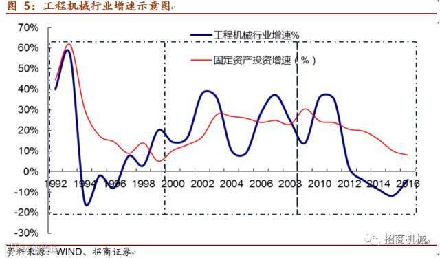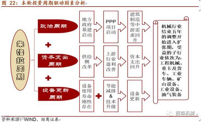 既然是分析投资周期首先从对投资敏感度最高的工程机械行业开始:工程机械行业经历了1999-2011年持续的高增长期,和2012-2016年近五年的收缩期,横跨了两个投资周期(朱格拉周期),2008-2009年的收缩期很短主要是因为推出“四万亿”投资计划,中国很快进入了新一轮的投资周期,同时也带来制造业的产能过剩和设备保有量闲置,直到2016年下半年开始好转。2016年下半年以来的回暖是否可以持续?我们认为目前是资本支出周期(下游客户盈利回升)+更新周期+政治周期(十九大)三个周期迭加,与朱格拉扩张期特点一致,工程机械行业拐点确立。