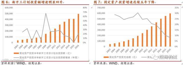 我们与中国上一轮朱格拉周期的高点做个比较:2011年固定资产投资30万亿,增速25%,2016年固定资产投资60万亿,增速8%,过去五年,虽然固定资产投资增速下降,但是固定资产投资总额翻了一倍。我们再看看对应的工程机械保有量,2011年最高点挖掘机、装载机、汽车起重机、泵车的保有量估计是9.4、12、1.8、4.3万台,2016年末的保有量11.8、14.2、2、6万,保有量增长明显小于固定资产投资规模,这说明这几年经济收缩,设备采购大幅下降,甚至推迟更新。到2016年底工程机械的利用率除了泵车,大部分工程机械产品已恢复到60%以上的开工率,甚至有些达到80%以上,所以只要固定资产投资总额不是负增长,设备投资增速将反弹,如果经济进入扩张期,那设备投资增速将超过固定资产投资增速。