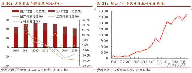 叉车行业长期受益于物流和劳动力替代,同时也受益于制造业投资回升。过去二十年,叉车在2009年、2012年两次朱格拉周期的收缩期出现过负增长,但是因受益物流行业的稳定增长调整幅度小于其它机械产品,同时,在制造业投资的高峰期叉车也表现出较好的弹性,我们认为2017年叉车销量增长将超预期。