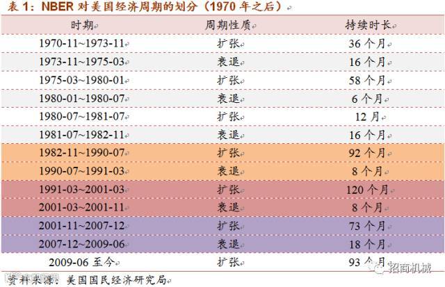 NBER(美国国民经济研究局)是私人的、非盈利、中立的经济预测组织,其成员来自政府、商业、学术等广泛的领域,其中有1300多名在北美大学任教的经济学和商学院教授,有24名研究员获得诺贝尔经济学奖。NBER对于美国经济周期的划分被认为是最权威的,其对于经济周期拐点的判定也是经济研究和投资决策的重要依据。NBER对于美国经济周期的划分始于1854年,至今共经历了66次周期。下表主要列举了1970年以来的经济周期。