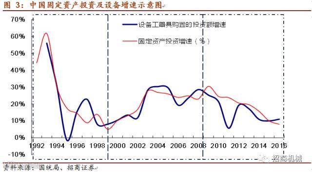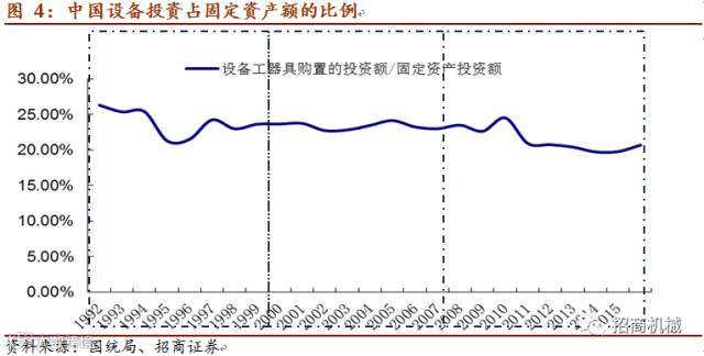 从下图的过去二十五年中国固定资产投资和设备投资增速来看,在经济扩张期,设备的投资增速通常高于固定资产投资增速,而在经济收缩期,设备投资的增速低于固定资产投资增速,同时是设备投资额占固定资产投资额比例下降。上一波朱格拉周期的收缩期是2012-2015年,机械需求大幅下降,很多传统行业亏损,设备投资增速严重偏离固定资产投资增速,2016年上半年触底。