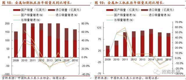 机床更新周期较长,复苏主要来自于制造业资本开支回升。2016年中国机床销量总额约为275亿美元,同比持平,主要机床品种销售额跌幅收窄。其中,金属切削机床销售额约为164亿美元,同比下降4.1%;金属成形机床消费额约为101亿美元,同比下降2.9%;工量具消费总额约为41亿美元,同比下降8.9%。2015年这三种主要机床的销量降幅分别为14.5%、12.6%、11.9%, 2016年机床销量跌幅收窄,行业企稳迹象出现。