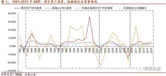 美国的机械设备行业也表现出强周期特点。在美国82年以来的四次朱格拉周期中,机械设备行业的整体波动幅度远高于GDP和固定资产投资增速的波动,尤其是紧缩期,机械制品出货量均出现大幅下降,降幅远超固定资产投资增速和GDP增速。每次机械设备行业的复苏大约持续2至4年不等。