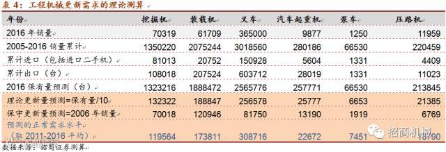 那工程机械销量大概会回升到什么程度? 其实,过去几年倍受诟病的“四万亿”和房地产投资目前也并没发生当时大家普遍预期的动车组空跑、房价暴跌、银行不良资产爆发的情况,三四线房地产消化也远好于预期。我们预期2017-2018年固定资产投资增速将回升,无论是来自基建、还是地方政府PPP项目、还是上游、中游盈利都已释放出积极信号,去年新开工计划投资总额增速也回升到20%。我们假设2016年末固定资产投资规模对应的设备保有量相对合理,若固定资产投资增速回升,设备增速回升幅度将更大。定量预测周期品需求很难,但是我们也可以大致判断一下行业可以回升到什么程度。上一波投资周期的高点是2011年,我们假设2011-2012年工程机械行业做了大量信用销售透支了之后五年的需求,也就是说用了五年时间来消化,而到去年底企业和经销商手上的二手设备也基本消化完了,只要固定资产投资不是负增长,那工程机械需求有望回升到2011-2016年年销量的平均值。我们估算了一下,挖掘机合理年销量为12万台、装载机17万台、汽车起重机2.2万台,相比2016年的年销量,分别还有70%、180%、155%的增长空间。所以说,工程机械有望迎来2年的复苏,恢复到上一波周期高点销量60-70%的水平,这个结果和我们后面的更新需求测算结果也比较接近。