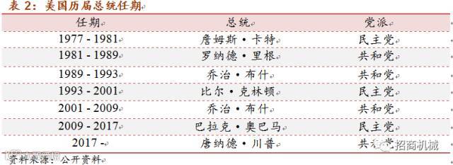 美国的机械设备行业也表现出强周期特点。在美国82年以来的四次朱格拉周期中,机械设备行业的整体波动幅度远高于GDP和固定资产投资增速的波动,每次扩张期机械设备行业的复苏大约持续2至4年不等。经济周期也会受到政治周期的影响,如果将美国历任总统执政期与上述经济周期相对应,会发现二者重合度较高。